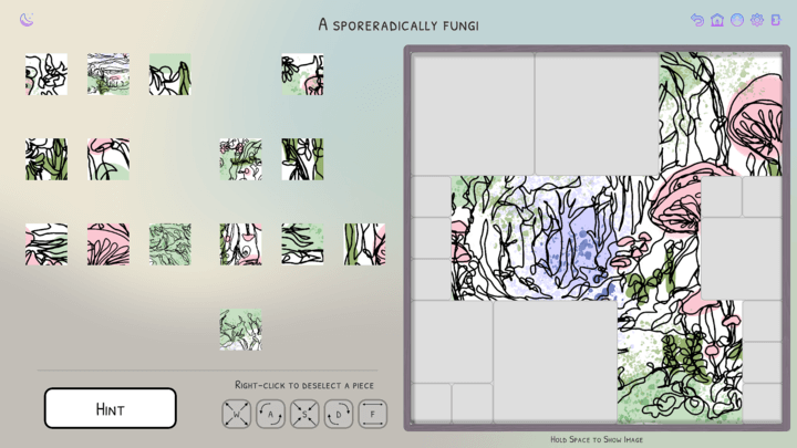 Squarepinski is a cosy but challenging puzzle game that reinvents the classic jigsaw. In this geometric challenge, every piece is the humble square; but don’t be fooled by their lack of tabs! Instead of relying on borders or corners, you'll be figuring out how big each piece needs to be, and which have been mirrored! It's jigsaw puzzling... but not as you know it.